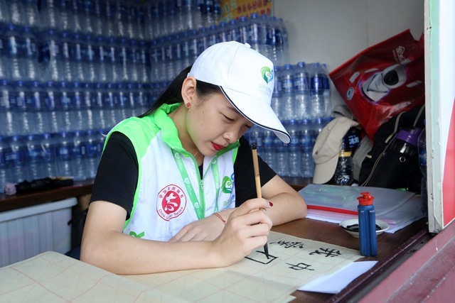 来自华南农业大学2017级的学生陈敏丹,一手美丽的毛笔字吸引了广大外国客商驻足。陈敏丹说:“除了为客商指引,解答问题,还能够以自己的特长展现中国文化,让客商更多的了解中国、了解广州,觉得自己的苦练没有白费。”
