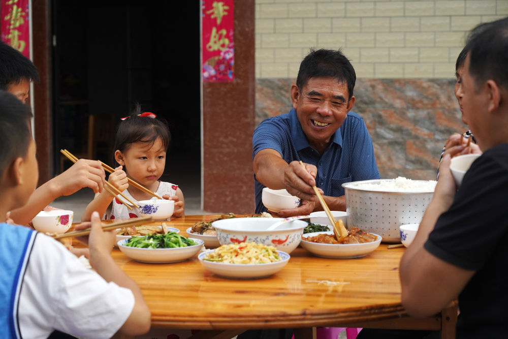 2021年7月1日,江西省瑞金市叶坪镇禾仓村村民曾得涛(中)和家人一起吃早饭。