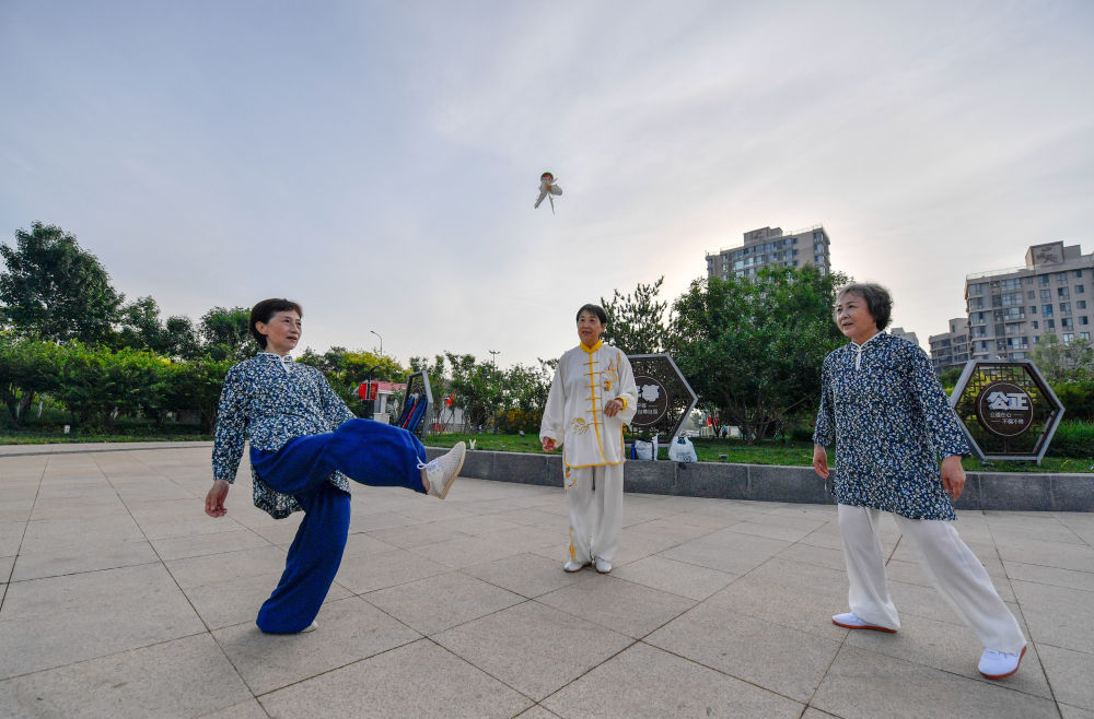 2021年7月1日,市民在天津市南翠屏公园内踢毽健身。