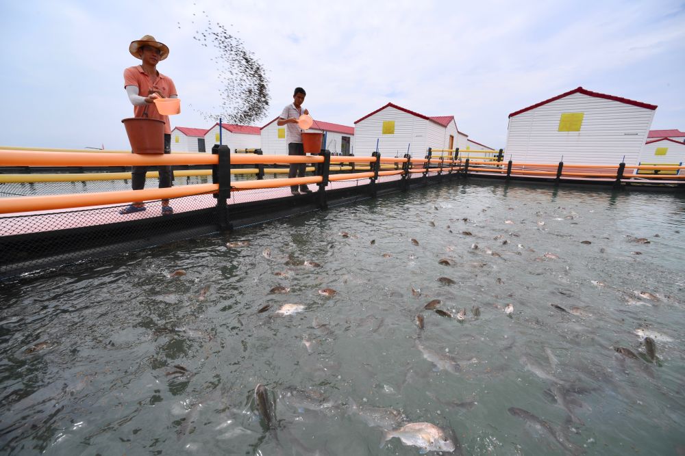 2021年7月1日,福建省宁德市霞浦县溪南镇七星海域转型升级的深水网箱养殖区工人在喂鱼。