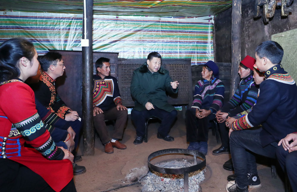 2018年2月11日,习近平在四川凉山彝族自治州昭觉县三岔河乡三河村节列俄阿木家中同村民代表、驻村扶贫工作队员围坐火塘边,共谋精准脱贫之策。