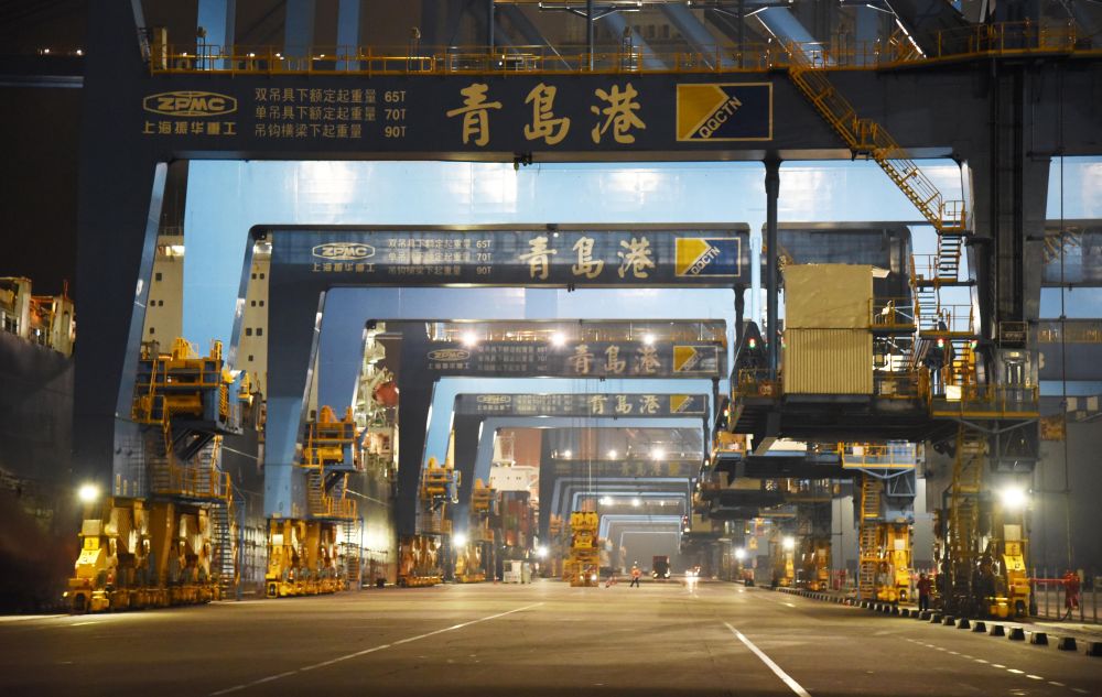 2021年7月1日凌晨拍摄的山东港口青岛港全自动化集装箱码头。