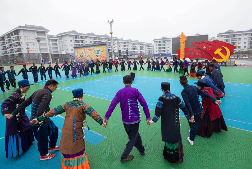 2021年7月1日,在四川省布拖县易地扶贫搬迁县城集中安置点(依撒社区),彝族群众在广场上跳彝族达体舞。