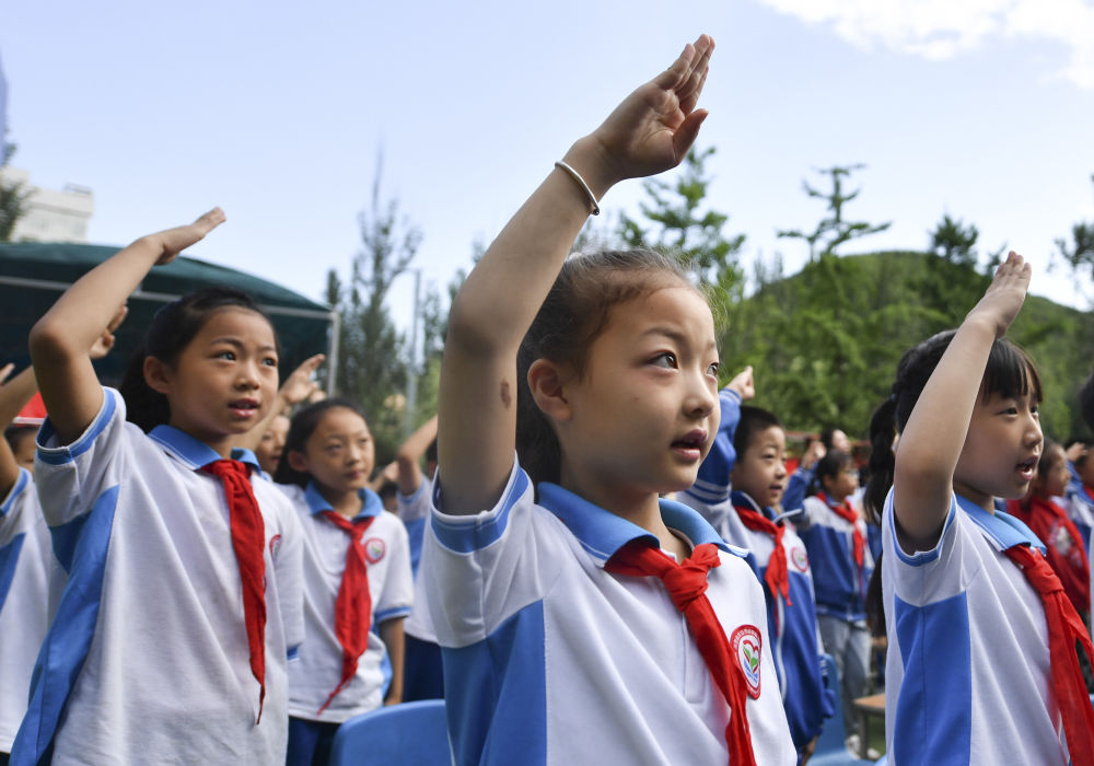 2021年7月1日,在陕西延安杨家岭福州希望小学,学生在收看庆祝中国共产党成立100周年大会时唱国歌。