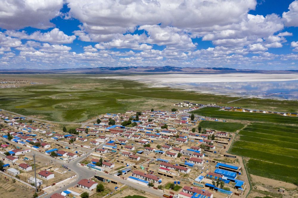 2021年7月1日拍摄的新疆巴里坤哈萨克自治县海子沿乡尖山子村(无人机照片)。