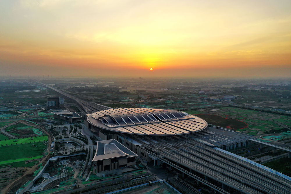 2021年7月1日在河北雄安新区京雄城际铁路雄安站拍摄的日出(无人机照片)。