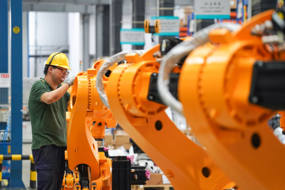 2021年7月1日,在位于南京市江宁区的南京埃斯顿自动化股份有限公司工业机器人生产车间,工作人员对组装好的工业机器人进行调试。