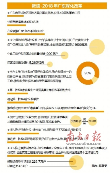 2019年,全省将继续下放一批省级管理权限,将省级权责清单事项从3018项压减到1000多项;推进实施企业投资项目分类管理和落地便利化改革,实现开工前政府审批时间民用建筑项目不超过41个工作日、工业项目不超过45个工作日;逐步推进解决城镇中低收入居民和新市民住房问题,试点推进共有产权住房建设,新开工棚户区改造安置住房2.4万套……从打造网上办事厅,到如今建设“数字政府”,新时代广东依然选择“刀刃向内”推动改革向纵深挺进。
