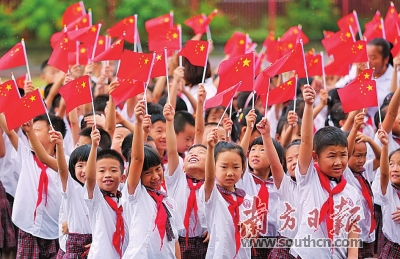 中山南区恒美学校开学典礼上,学生一起挥舞国旗。 南方日报记者 叶志文 摄