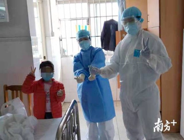 早上10时,滨海湾中心医院王义烔副主任医师和陈蓉主管护师进入东莞市第九人民医院的隔离区查房,9岁的小姑娘轩轩(化名)今天身体明显好转,露出了久违的笑脸。看到照顾她的医护叔叔阿姨,轩轩高兴地左手比“心”,右手作出胜利手势,要跟大家合影。