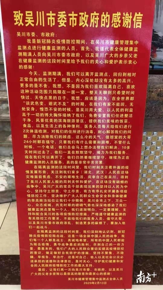 “在全世界都‘谈武色变,避武不及’的时期,在我们有家不能回、无处安身、惶恐不安的时候,是吴川用大爱,以人民的利益高于一切的博大胸怀接纳了我们,免费安置我们住进整洁干净、风景优美的滨海旅游景区,提供我们美味的饭菜、食品,以及生活上的各种便利。”这是2月13日监测期满即将离开监测点的第一批健康管理集中监测的62名湖北籍游客集体写给吴川市委市政府的感谢信的一句话。