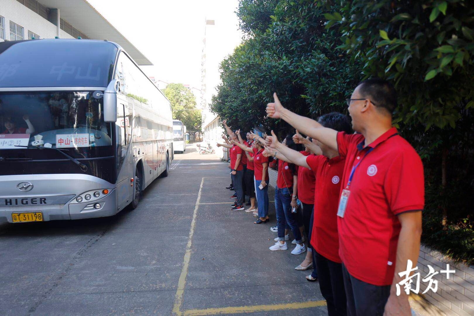 【中山市东区中学】上午7点50分,该校考生乘坐10辆大巴前往中山市濠头中学考点。“高考高考,开心去考。2020,一定会赢。”大巴出校门,全校行政教师统一身着红色上衣,夹道欢迎。大巴出校门后,铁骑在大巴前后为考生开路,开启一条绿色通道。