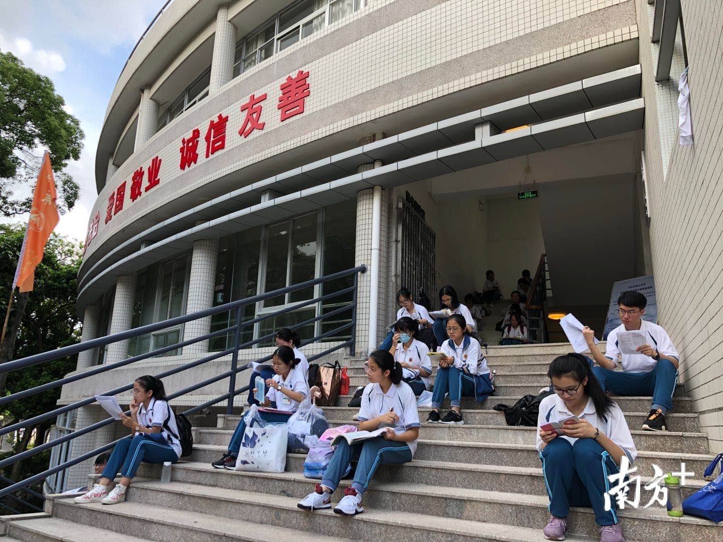 【汕头金山中学考点】静谧的校园,学生们坐在楼梯上复习,成为一道靓丽的风景线。(记者:余丹)
