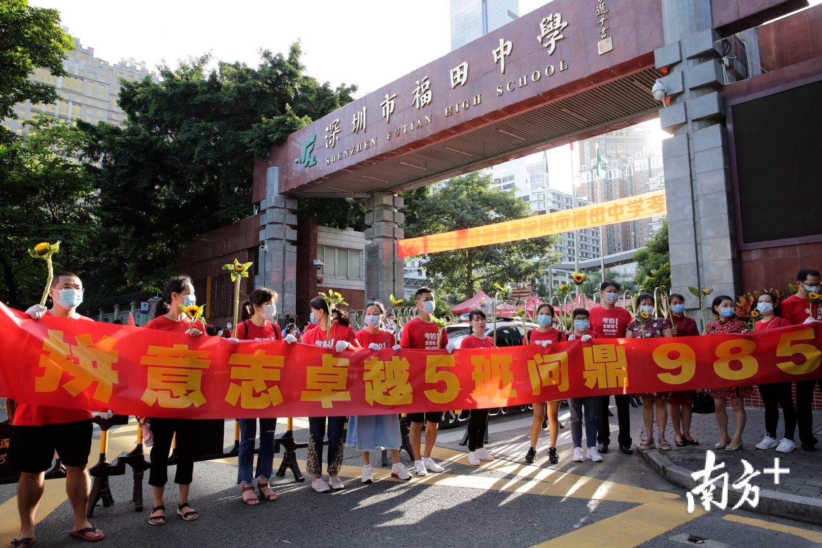 【深圳市福田中学】考生有序进考场,送考的家长和老师们在校外拉出横幅为同学们加油。 (记者:鲁力 )