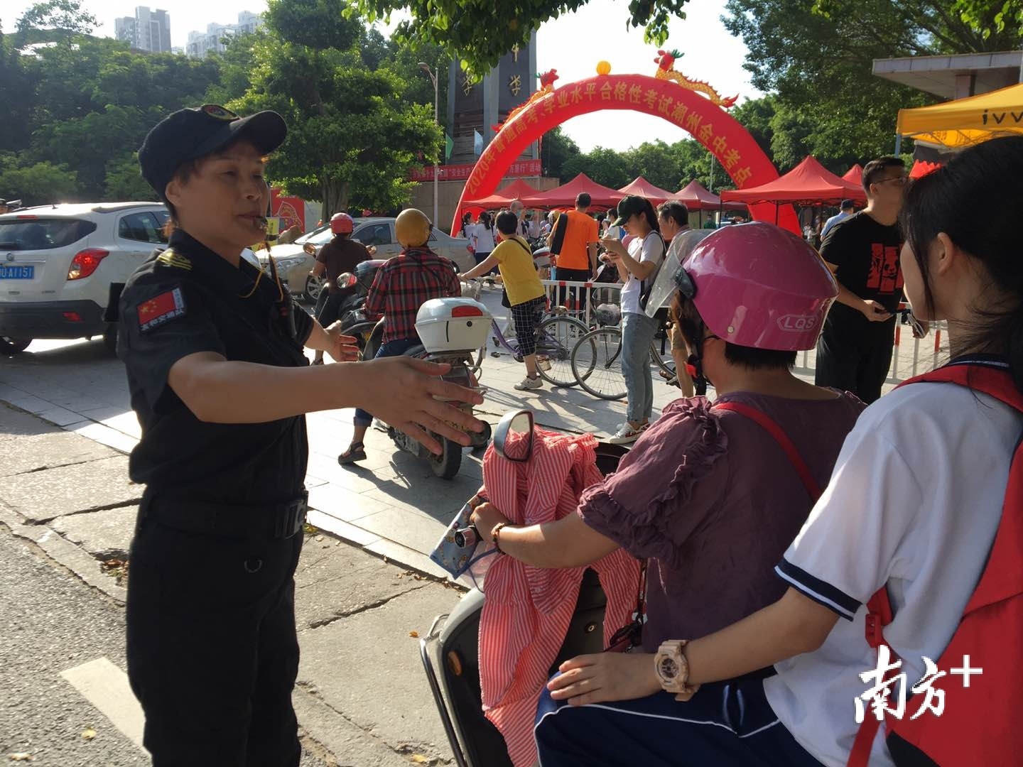 【潮州金山中学考点】校门口的友和交通队正在进行道路交通疏通。领队郑丽华说,每年高考的这里道路交通疏导都是由他们协助,迄今为止已经有4,5年了。6点50分前交通大队人员已全部到齐,进行工作。(记者:苏仕日 实习生:卢文蓉)