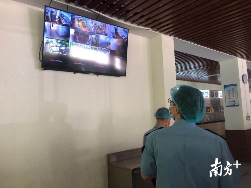 【江门 培英高中考场】#高考食品安全#检查人员在培英高中通过明厨亮灶工程查看后厨。(记者/摄影:张泳渝)