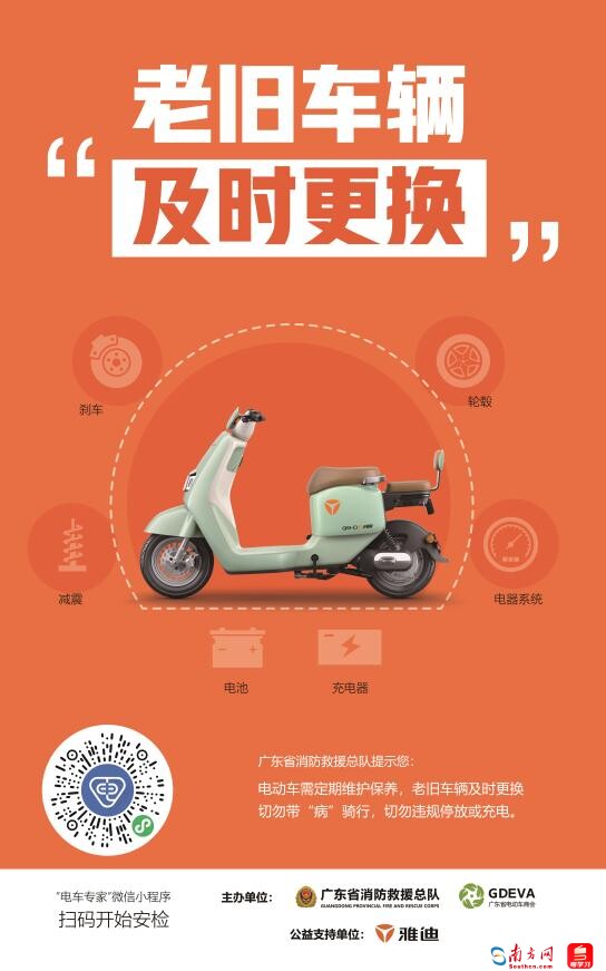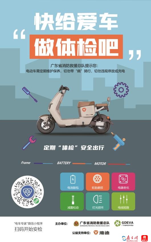 据介绍,广东省消防救援总队联合广东省电动车商会,结合《广东省深化电动自行车领域消防安全综合治理工作方案》(粤消安〔2022〕5号),逐步组建市、县、镇三级电动自行车公益安检队,联合街道和小区物业免费开展电动自行车安全检修进社区活动,并应用数字化平台开展全省电动车安全检修,更好地帮助广大市民排查电动自行车的消防安全隐患。