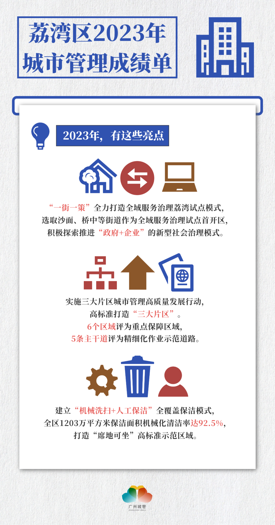 2023年,荔湾区城管部门全力打造全域服务治理荔湾试点模式,选取沙面、桥中、白鹤洞等街道作为全域服务治理试点首开区,进一步提升城市客厅整洁度。