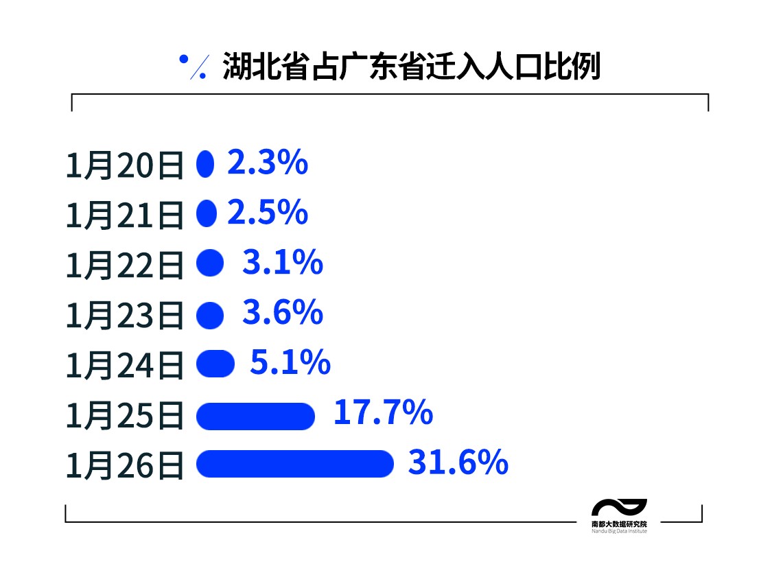 受到武汉迁出规模缩减的影响,尽管比例变大,但实际从武汉流入广东的人口规模并无增长,且从25日后这一规模逐渐缩小。