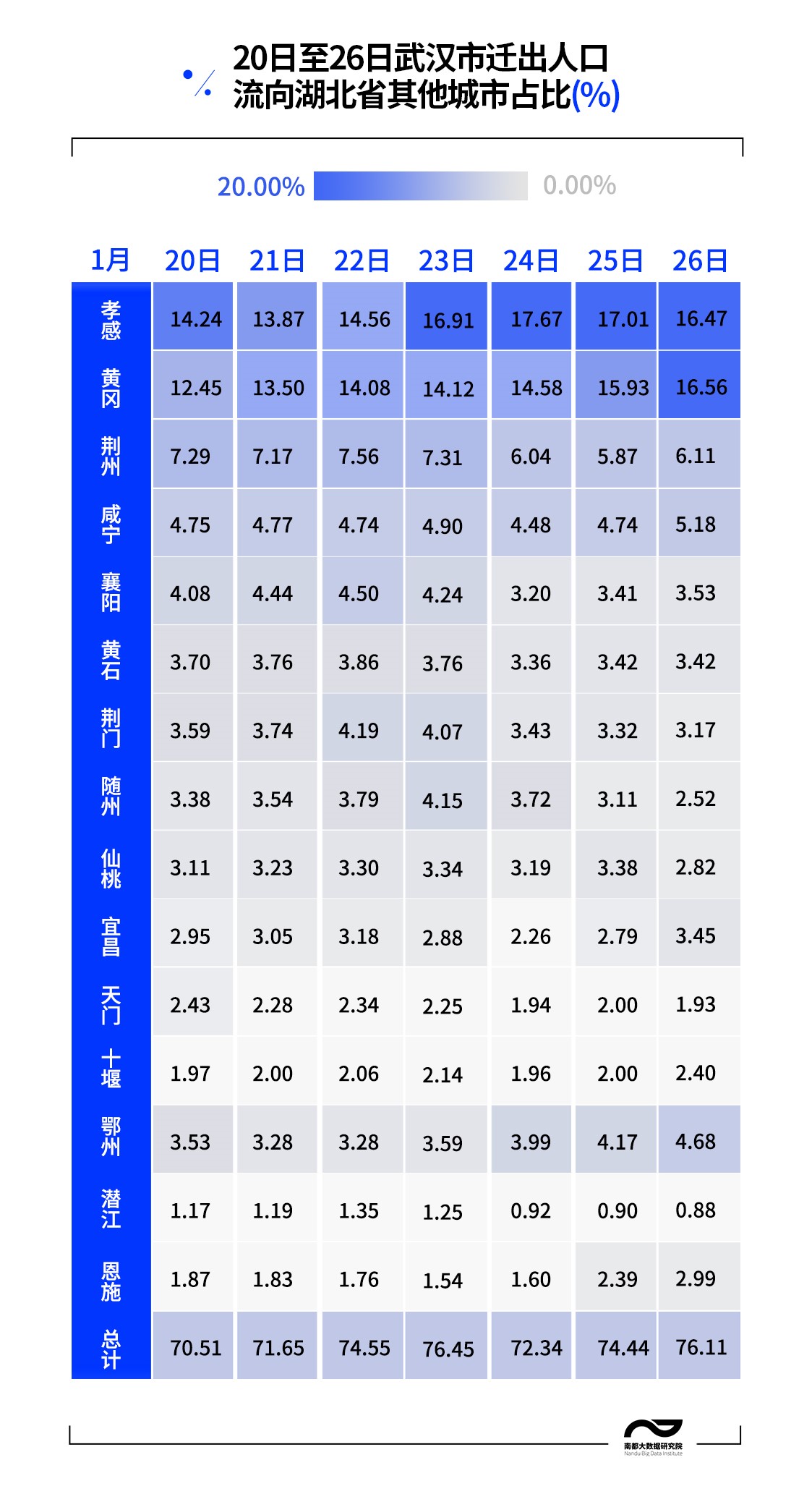 再具体到武汉迁出人口,会发现,该市的人口迁出规模在1月23日“封城”当天下降趋势并不明显,但在1月24日显著下降,仅为22日最大值的三分之一。湖北省内的其他地级市是武汉市迁出人口的主要去向,20至26日每日有超过70%的武汉迁出人口流往了孝感、黄冈、荆州等周边省内城市。