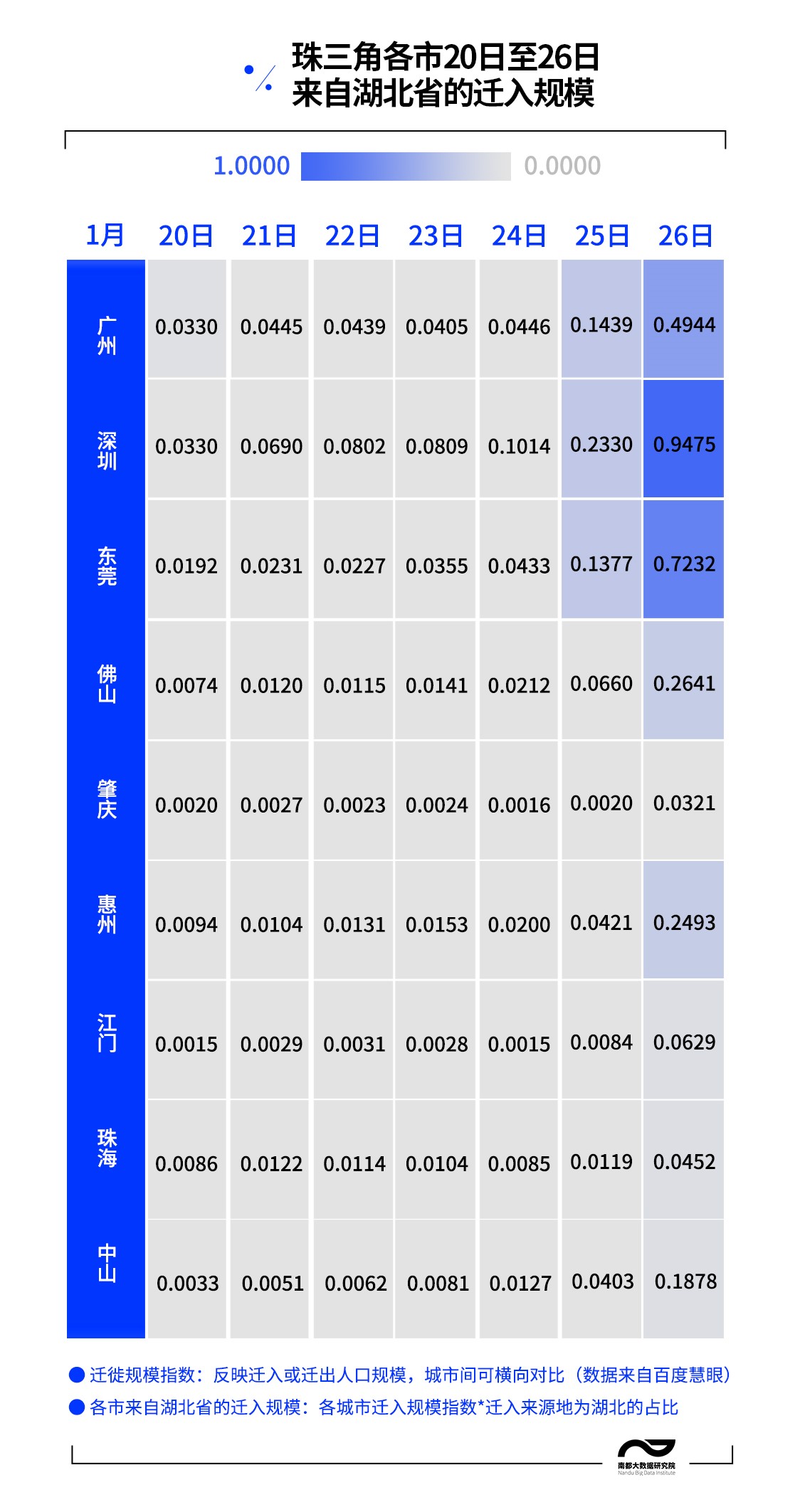 但比例并无法明确迁入规模的大小,具体看珠三角地区城市中湖北省迁入规模的情况,20至24日较为稳定或呈现小幅下滑,25至26日珠三角各市湖北省迁入人口规模逐渐增长。自20至26日累计计算,湖北省迁入人口规模最大的珠三角城市是深圳,其余依次是东莞、广州、佛山、惠州、中山、珠海、江门、肇庆。