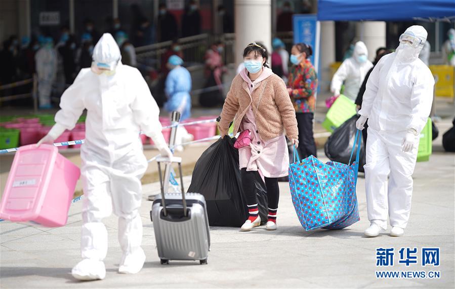 3月10日,在武汉江夏方舱医院,医护人员帮助新冠肺炎治愈患者(中)拿行李。 新华社记者 才扬 摄