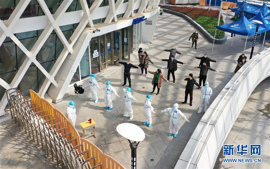 3月10日,在武汉江夏方舱医院,医护人员教患者练习八段锦(无人机照片)。 新华社记者 才扬 摄