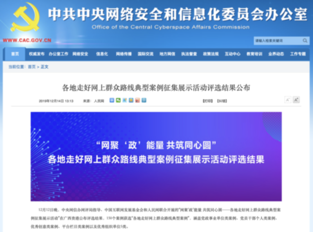 南方网讯 由中央网信办网评局指导、中国互联网发展基金会和人民网联合开展的“网聚‘政’能量 共筑同心圆——各地走好网上群众路线典型案例征集展示活动”公布评选结果,全国共150个案例获选“各地走好网上群众路线典型案例”,涵盖党政事业单位类案例、党员干部个人类案例、优秀创意类案例、平台栏目类案例以及优秀组织单位5类。