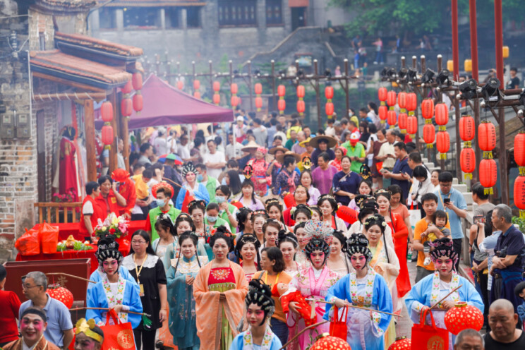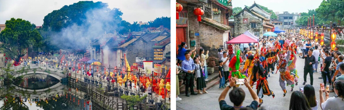 每到周末,南社古村热闹非凡。龙狮汇演引得大批群众围观拍照,游船粤剧表演、古琴表演为古村更添了一番韵味,茶山手信文旅集市、非遗精品展,让游客收获满满。