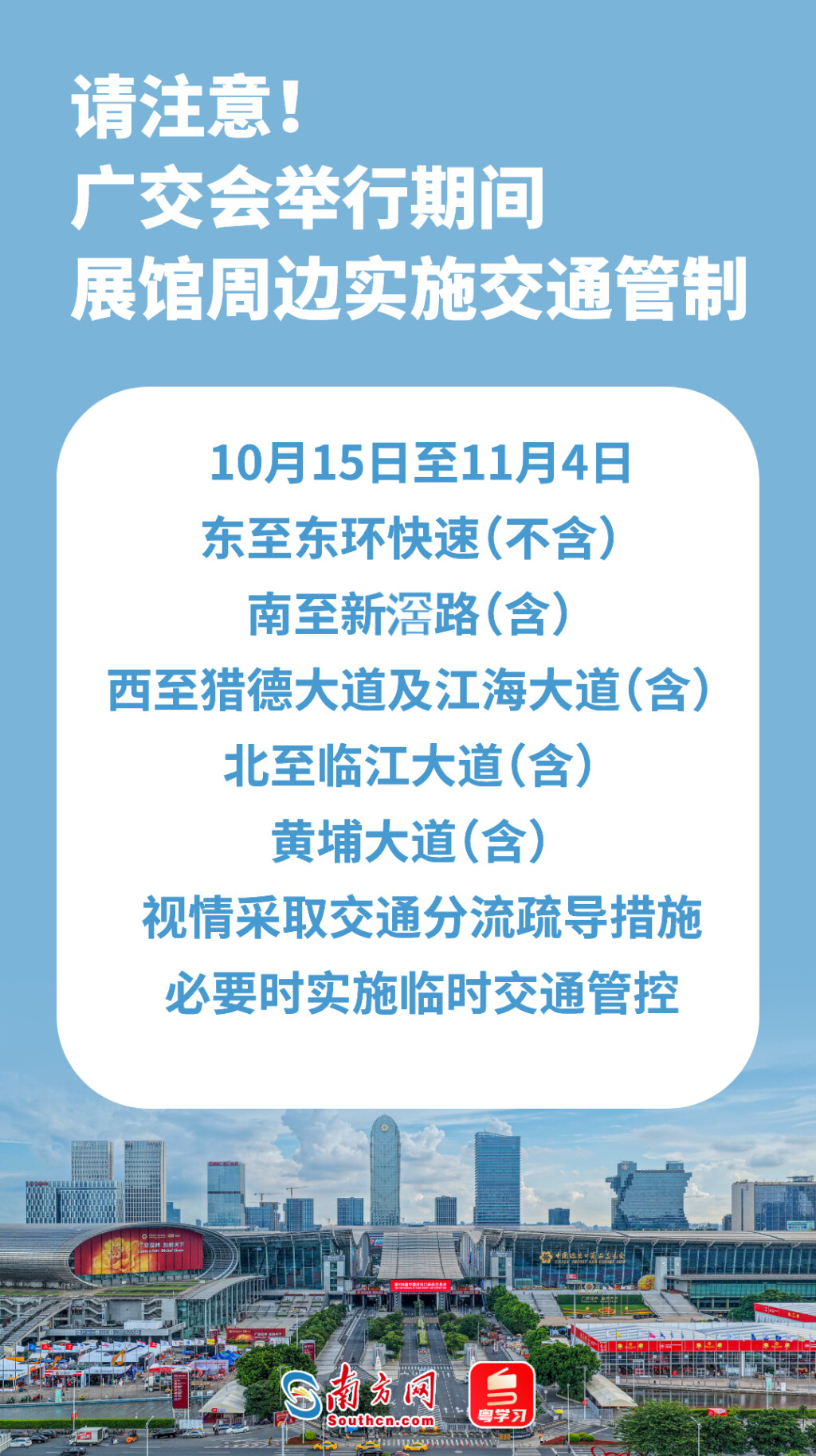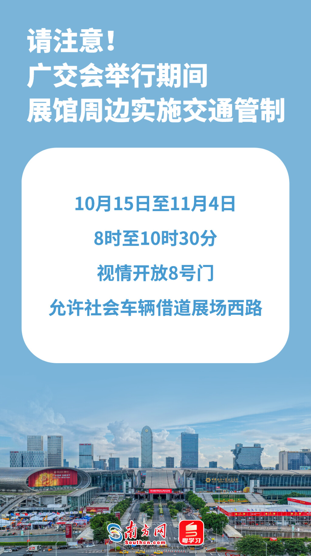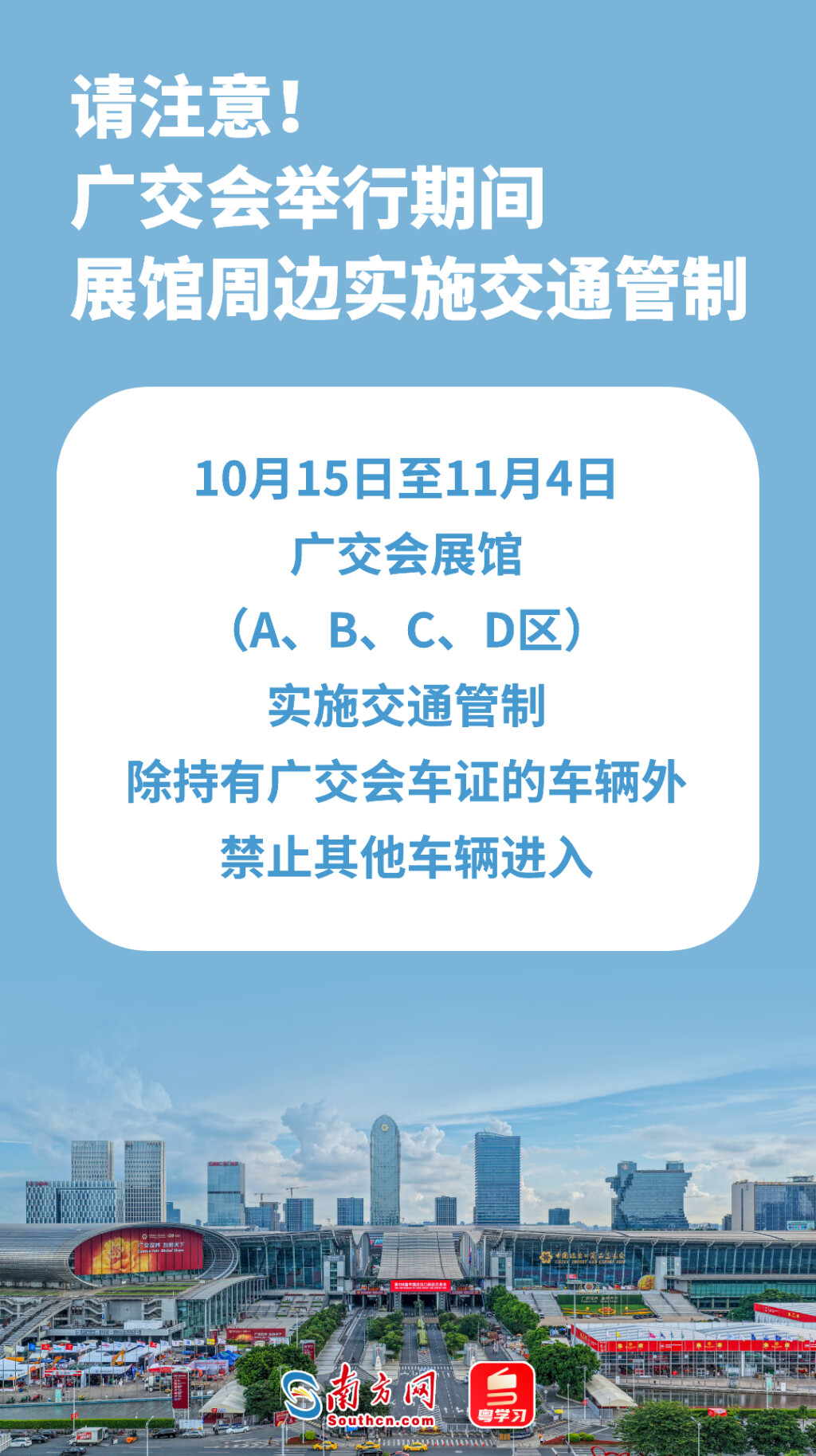 10月15日至11月4日,广州交警将在广交会展馆(A、B、C、D区)实施交通管制,除持有广交会车证的车辆外,禁止其他车辆进入。每天进场高峰期间(08:00至10:30)视情开放8号门,允许社会车辆借道展场西路,畅通交通微循环。