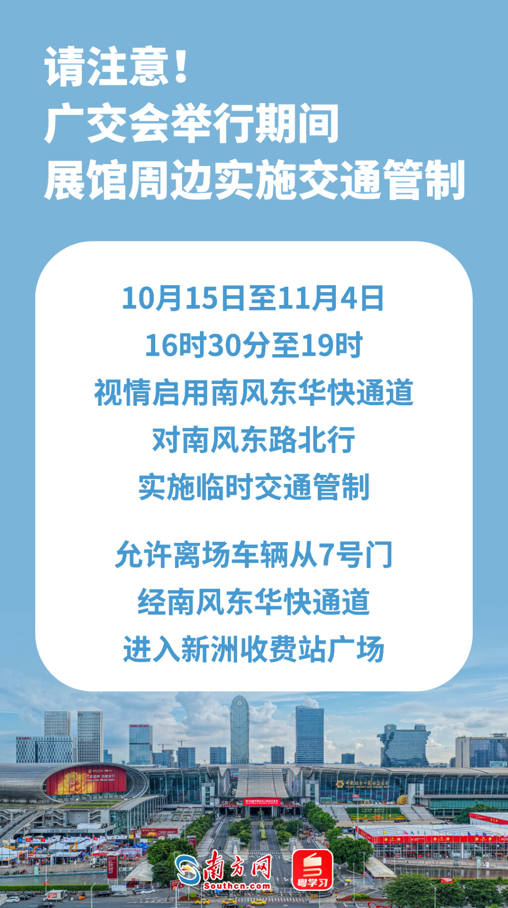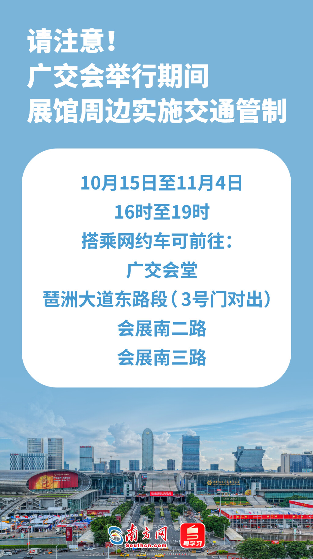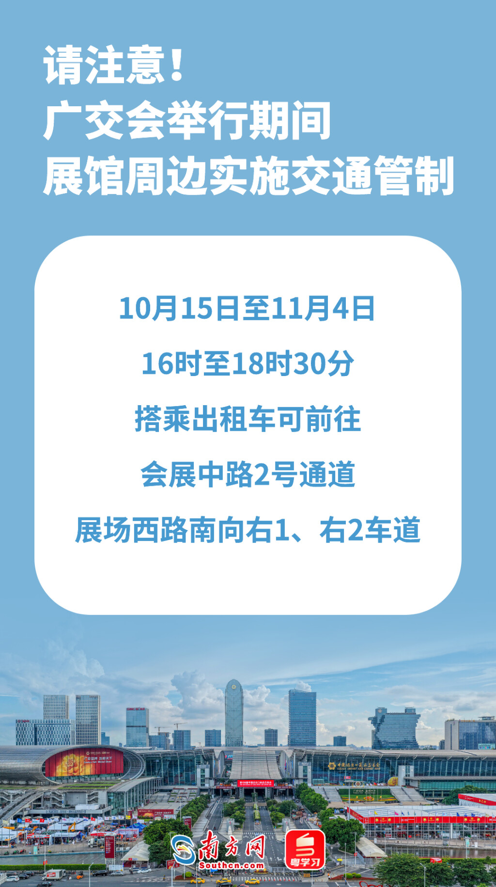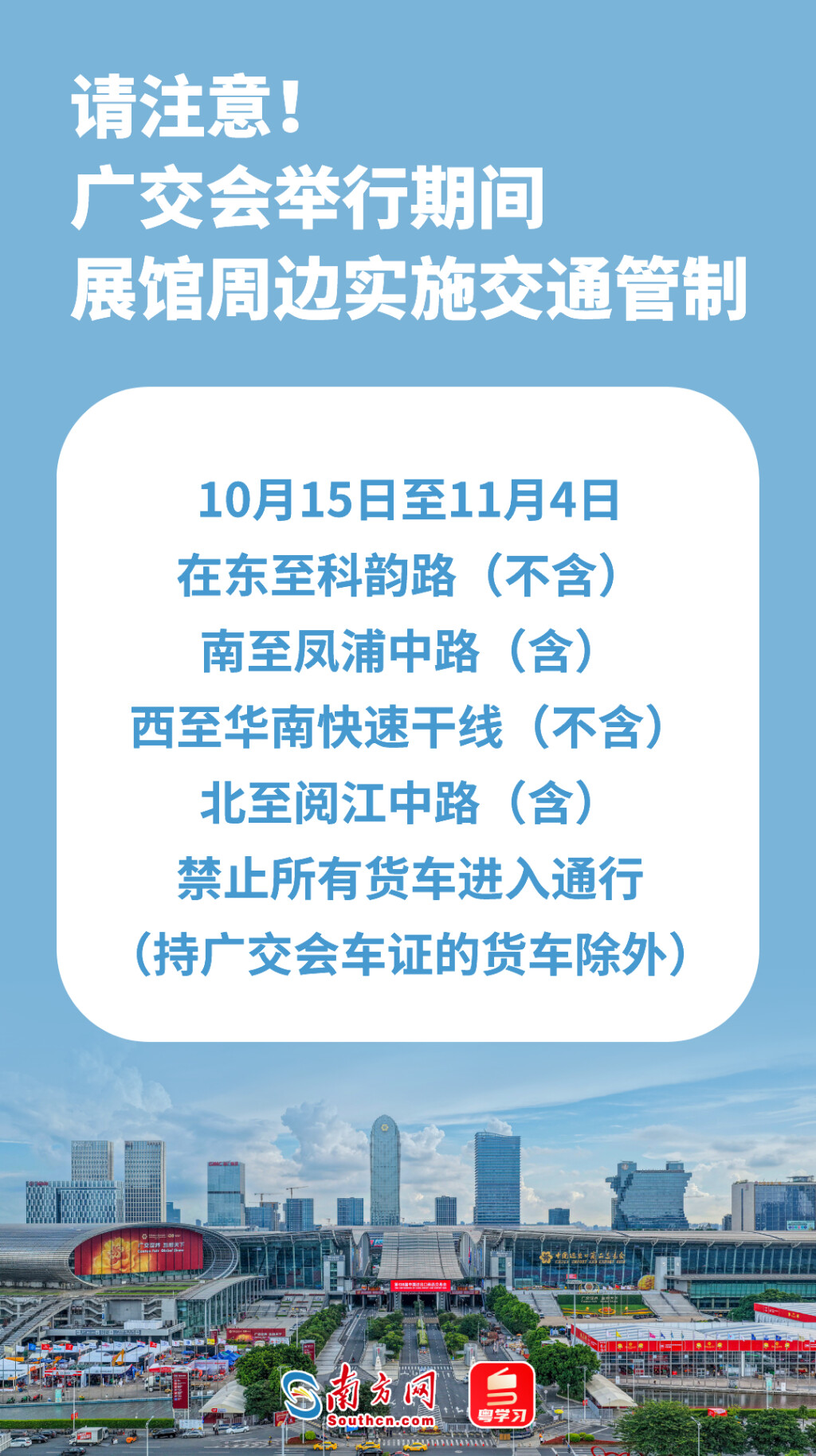 10月15日至11月4日,广州交警将在广交会展馆(A、B、C、D区)实施交通管制,除持有广交会车证的车辆外,禁止其他车辆进入。每天进场高峰期间(08:00至10:30)视情开放8号门,允许社会车辆借道展场西路,畅通交通微循环。