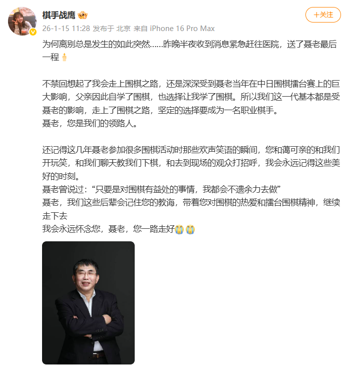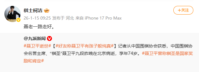 据中国围棋协会和聂卫平家属消息,中国围棋协会名誉主席、“棋圣”聂卫平因病医治无效,于2026年1月14日22时55分与世长辞。