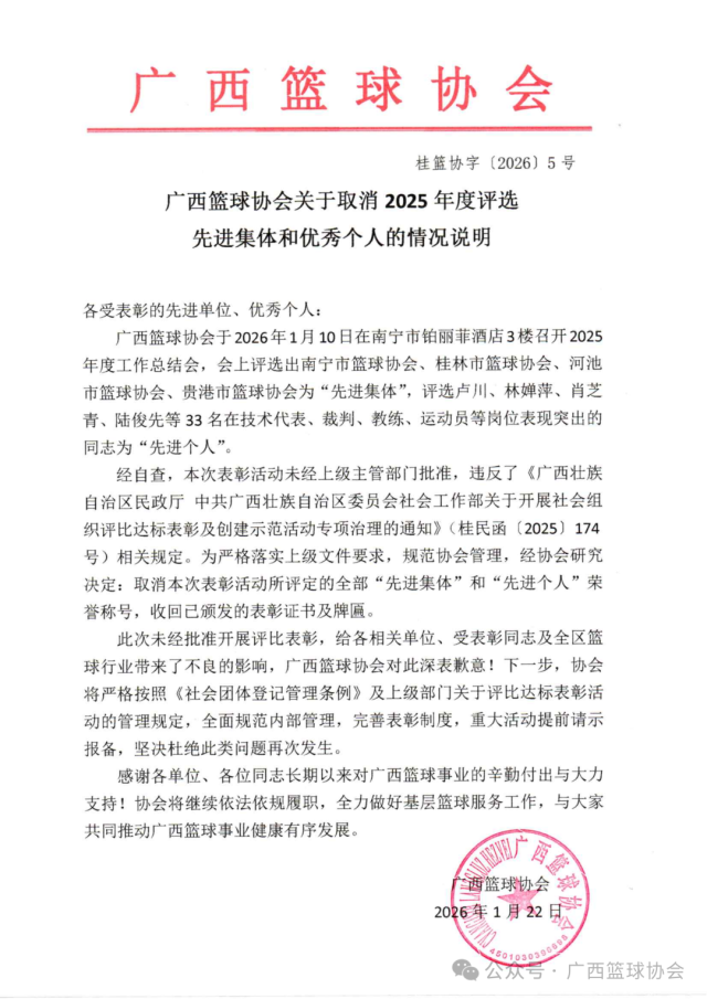 1月22日,广西篮球协会发布关于取消2025年度评选先进集体和优秀个人的情况说明: