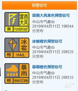 4月11日19时44分,中山发布全市雷雨大风黄色预警信号,未来1-2小时将有雷雨,局部雨势较大,并伴有短时大风。20时25分,中山市气象台发布冰雹橙色预警信号。