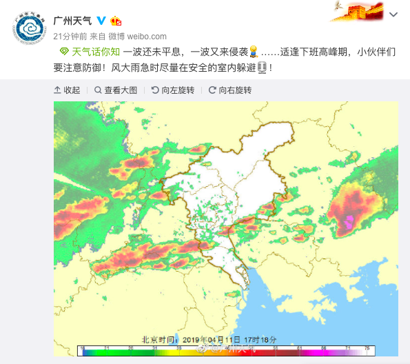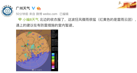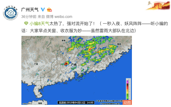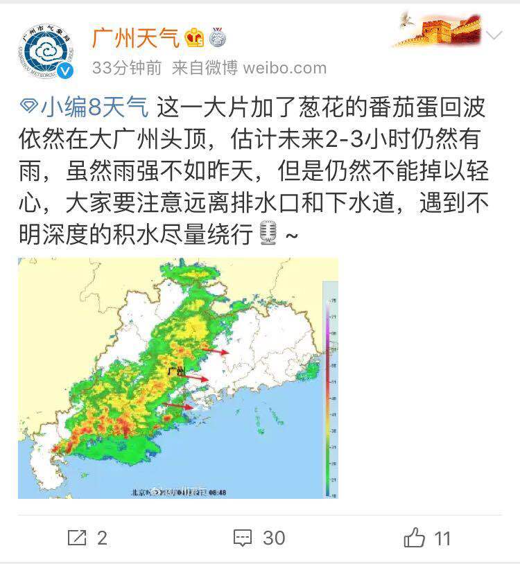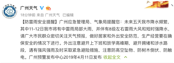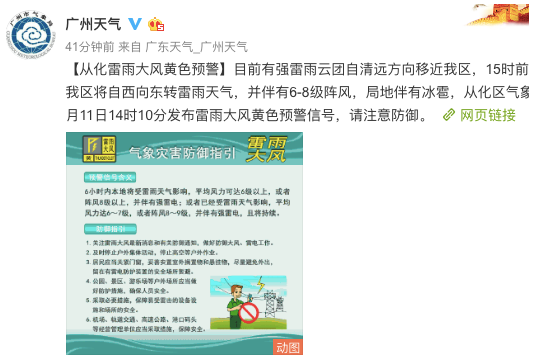 上午11点,广州市气象台官方微博“@广州天气”发布防雷雨安全提醒显示,