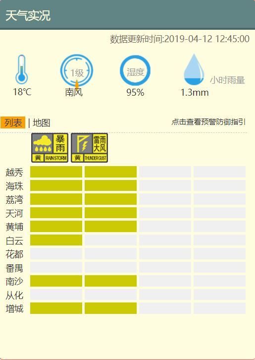 【番禺区暴雨预警解除】受雷雨带影响,过去几小时我区普降中到大雨,最大降雨出现在南村镇,为33.3毫米。目前我区雨势已明显减弱,番禺区气象台于4月12日12时39分解除暴雨预警信号。