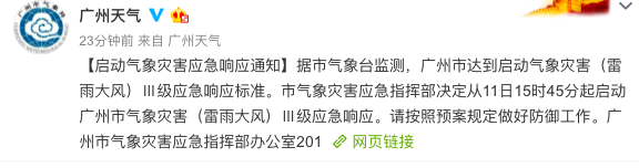 【启动气象灾害应急响应通知】据市气象台监测,广州市达到启动气象灾害(雷雨大风)Ⅲ级和(暴雨)Ⅲ级应急响应标准。