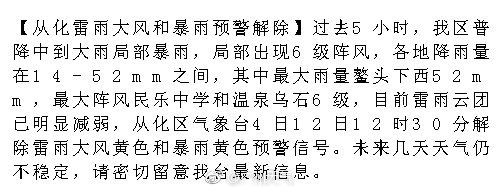 【从化雷雨大风和暴雨预警解除】过去5小时,我区普降中到大雨局部暴雨,局部出现6级阵风,各地降雨量在14-52mm之间,其中最大雨量鳌头下西52mm,最大阵风民乐中学和温泉乌石6级,目前雷雨云团已明显减弱,从化区气象台4日12日12时30分解除雷雨大风黄色和暴雨黄色预警信号。未来几天天气仍不稳定,请密切留意广州市气象台最新信息。(图片来源:@广州天气、广州天气网站)