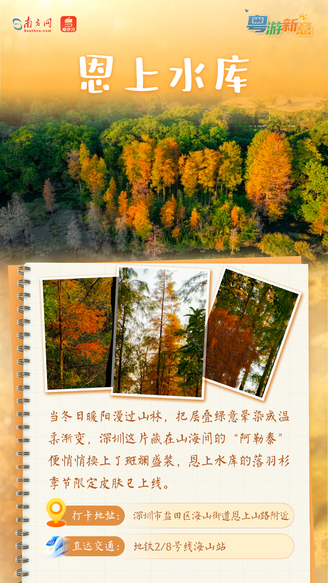 北有红叶,南有落羽杉。每年这个时候至2月,深圳各大公园的落羽杉陆续换装,为这座四季常青的城市带来焦糖色“冬日限定”,橙、黄、红三色的大片落羽杉美得如同油画一般。趁着落羽杉正当时,不妨找一个阳光正好的午后走进公园,感受大自然的美好。