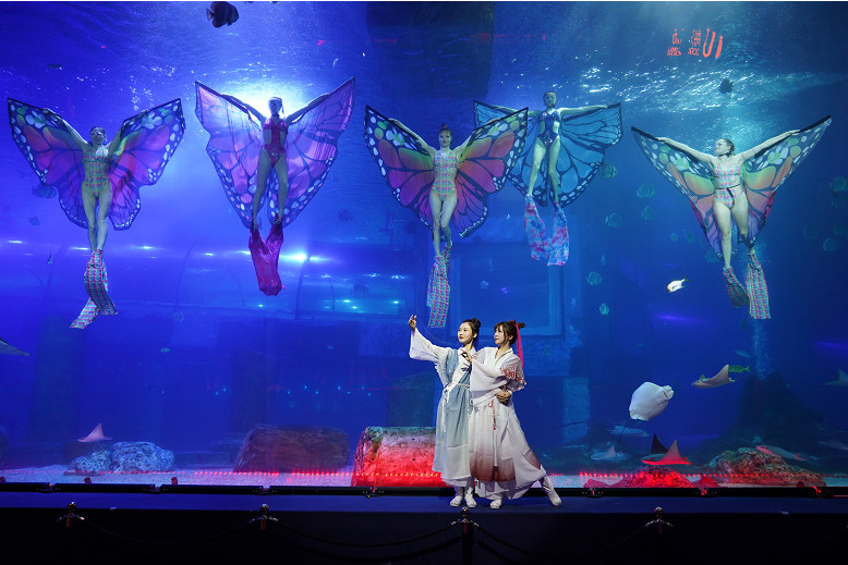 暑假期间,海底《梁祝》每天在正佳极地海洋世界的网红场景——长达40.809米的吉尼斯纪录深海实景展缸内上演,结合高难度的水下动作编排与层层递进的音效与视觉呈现,精彩演绎了梁山伯与祝英台从三载同窗到约誓定情,最后双双化蝶的凄美爱情故事。在湛蓝、浩瀚的海底世界中,黄金鲹、魟鱼、鲨鱼等海洋生物轻盈穿梭在美人鱼演员身侧,并与之和谐共舞,为到场的游客带来令人沉醉、触动身心的视觉享受。