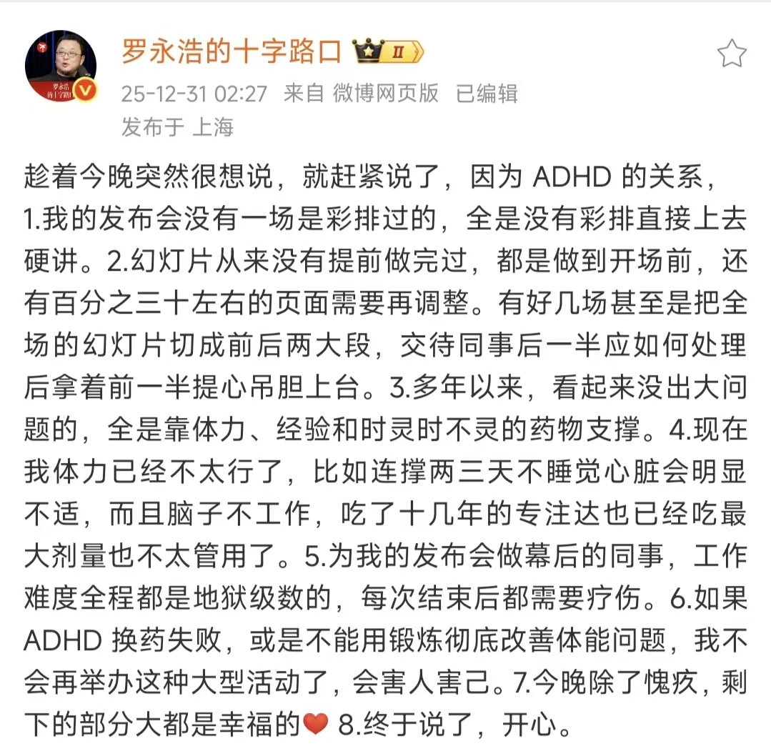 12月31日凌晨,罗永浩在个人微博发文,对12月30日晚发布会的状态作出解释,并首次公开披露自己长期患有ADHD(注意缺陷多动障碍)。他在文中称,受疾病影响,自己过往的发布会“没有一场是彩排过的”,演讲与内容准备长期处于高度临场状态,幻灯片往往在开场前仍需反复调整,有时甚至将整场内容拆分为前后两部分,边上台边推进。