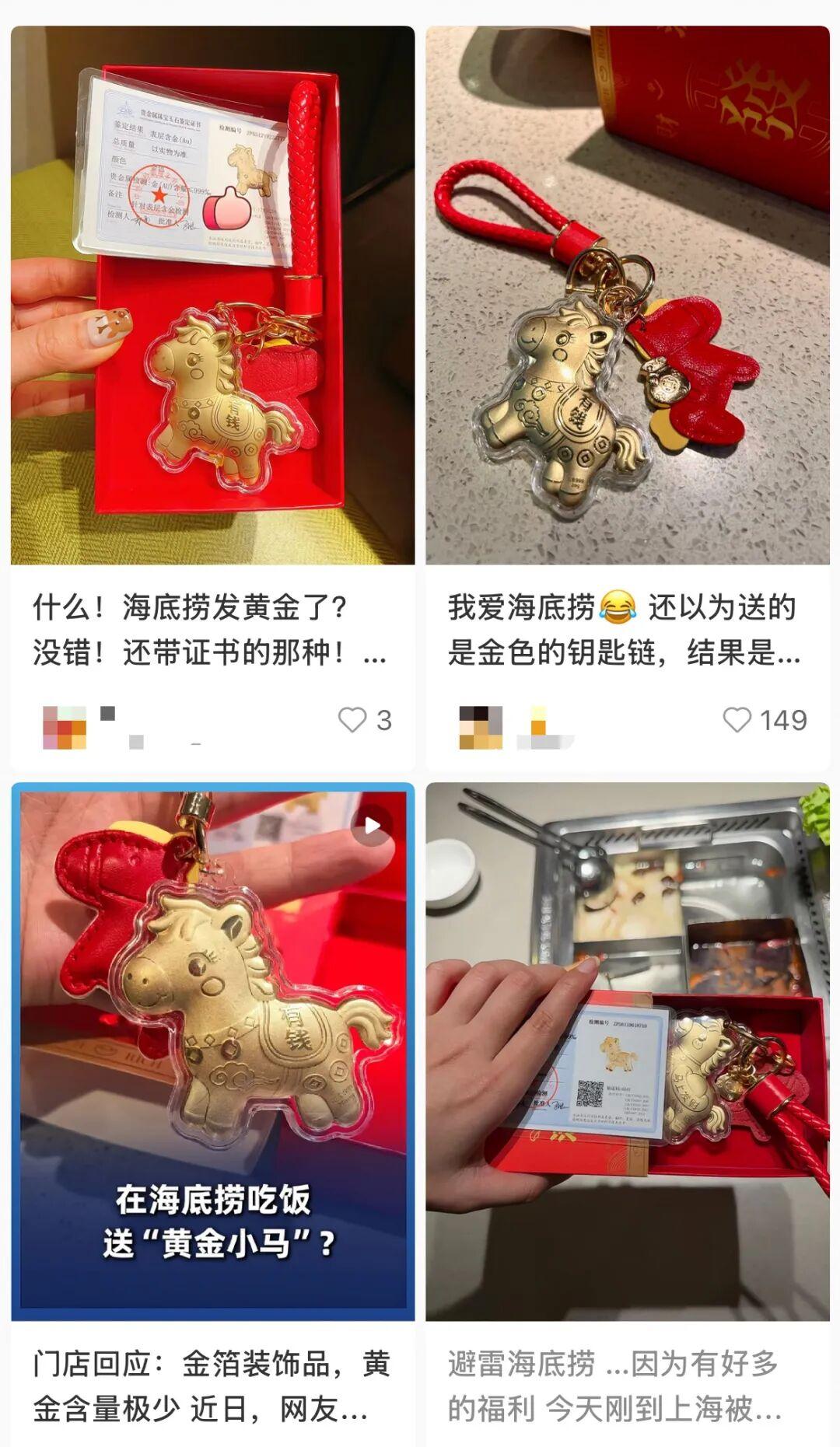 近日,网友分享在海底捞某门店就餐后免费领取了一只“黄金小马”挂件。