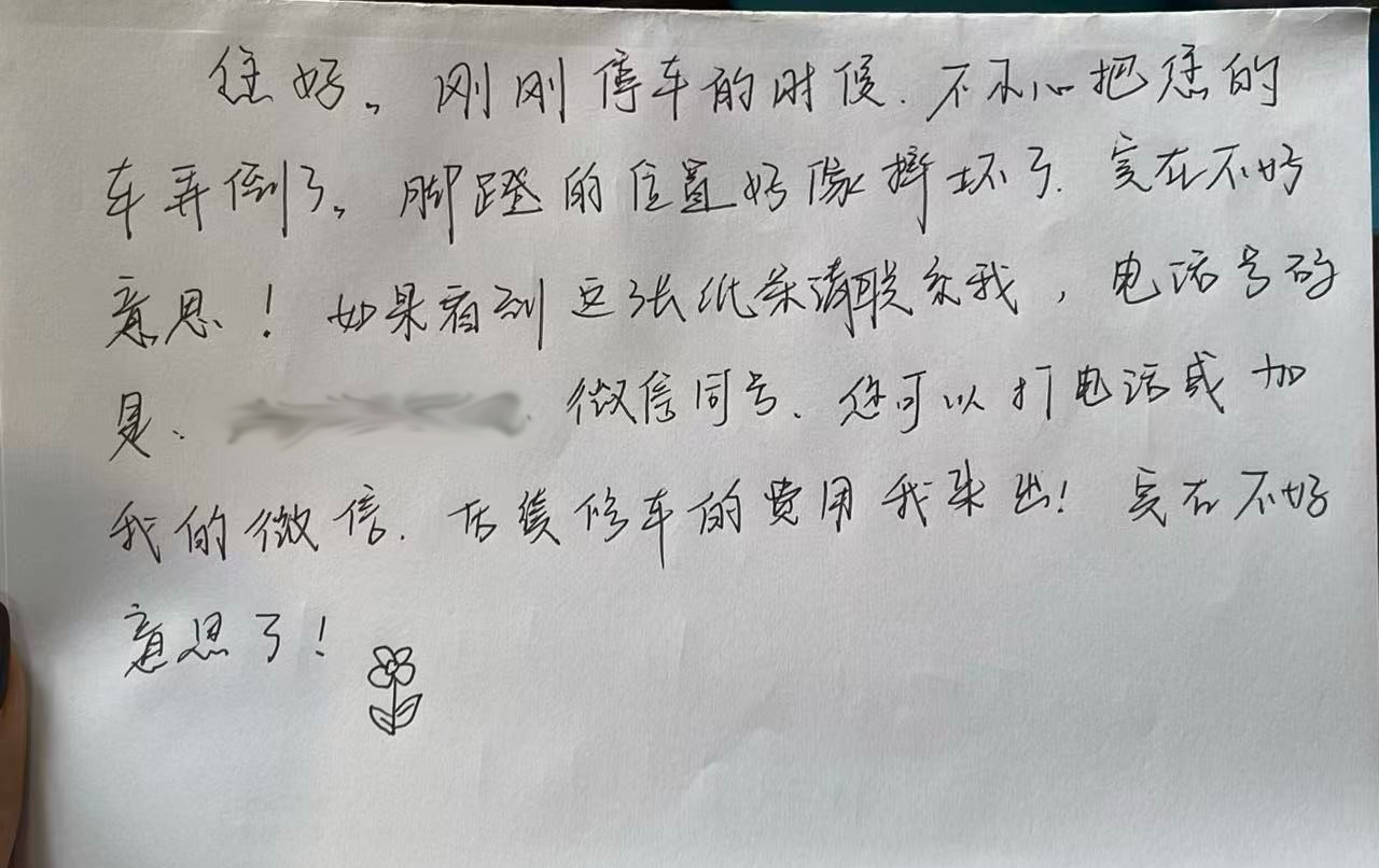 那时,李瑞恩骑着电瓶车不小心碰倒了一辆停在路边的车。周围空无一人,她完全可以悄悄离开,可这个实诚的姑娘,却写下一张纸条,工工整整地贴在对方车上:“您好,刚刚停车的时候,不小心把您的车弄倒了,脚蹬的位置好像摔坏了,实在不好意思。如果看到这张纸条联系我,电话号码是185XXXXXXXX,微信同号。您也可以打电话或加我的微信,后续修车的费用我来出,实在不好意思!”