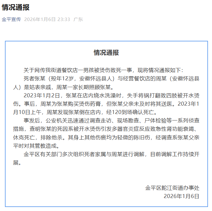 广东省汕头市金平区鮀江街道办事处2026年1月6日晚发布情况通报称: