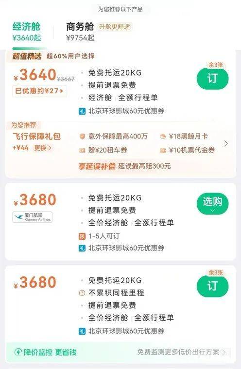 视觉展示误导——通过页面设计将增值服务进行视觉分隔,造成单独收费的假象。例如,记者在另一购票平台查询了一趟从三亚到北京的机票,排名第一的选项价格为3640元,“订票”按钮的设置与价格平行,在一条分隔线下方写着“为您推荐飞行保障礼包”,看起来这是一个需要额外点击才会购买的独立选项,但实际上这也是一个捆绑销售的套餐产品。