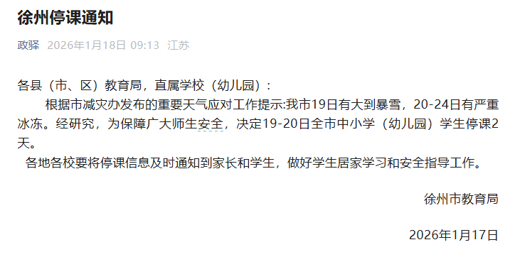 1月18日,江苏徐州市教育局发布通知,根据市减灾办发布的重要天气应对工作提示:我市19日有大到暴雪,20—24日有严重冰冻。经研究,为保障广大师生安全,决定19—20日全市中小学(幼儿园)学生停课2天。