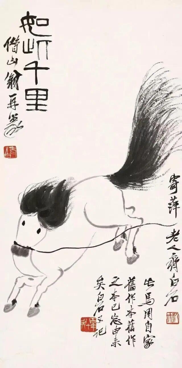 “马彪彪”原型来自齐白石晚年画的奔马图《如此千里》,齐白石用几笔水墨勾勒出了一匹奔马的形象,马匹的姿态看上去稚拙而生动,但神韵突出,力量感和速度感非常强。