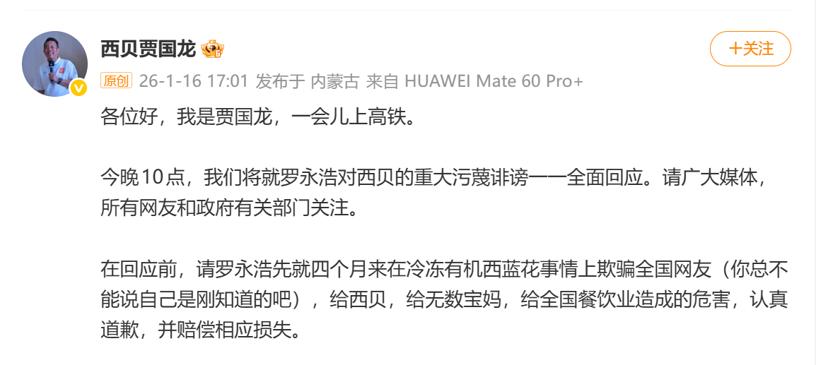 近日,西贝宣布关闭国内百余家门店引起广泛关注。今日(16日)15时,罗永浩通过微博发长文回应,称没见过一个企业仅仅因为被黑就能倒闭的,并强调自己已两次主动收手。帖文引起舆论发酵。两小时后,贾国龙在微博发布“预告”,称将于今晚10点“就罗永浩对西贝的重大污蔑诽谤一一全面回应”,并要求罗永浩认真道歉、赔偿损失。