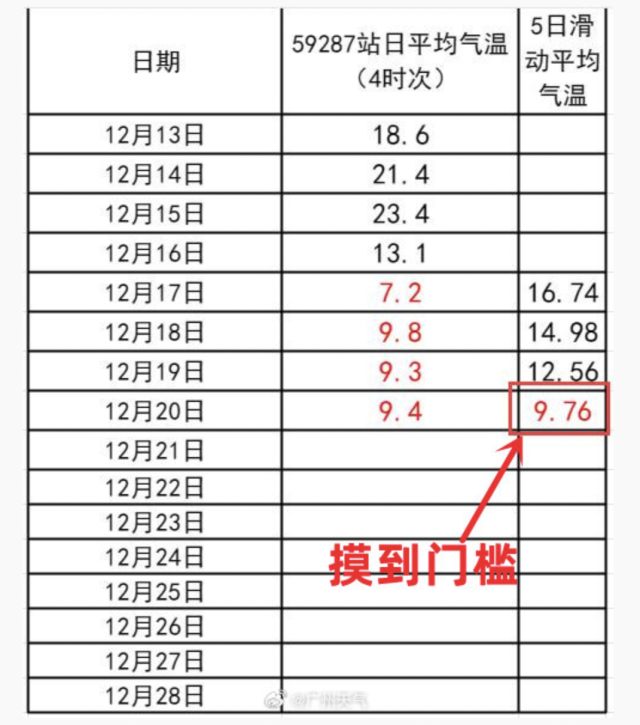 冷空气的持续影响,也让广州有望在气象意义上入冬。据@广州天气,广州已经摸到入冬门槛。入冬标准为连续五日的5天滑动平均气温<10℃(图1列3)。入冬日:五天滑动时间序列第一个<10℃的日期。根据前几天降温的铺垫,昨天(20日)广州站的5天滑动平均气温首次跌破10℃,终于摸到了那苛刻的冬天门槛。不过最终能否入冬,还要看未来几天的气温情况。