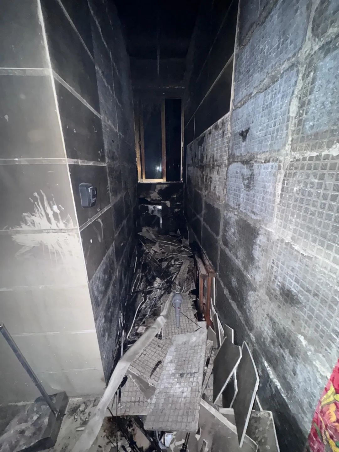 消防员到场后,立即展开灭火救援工作,现场明火很快被扑灭。起火部位位于该小区1栋第15层楼梯间,燃烧物主要为业主堆放的杂物,起火点四周墙壁被浓烟熏黑,大片瓷砖被烧至脱落。所幸此次火灾未造成人员伤亡。